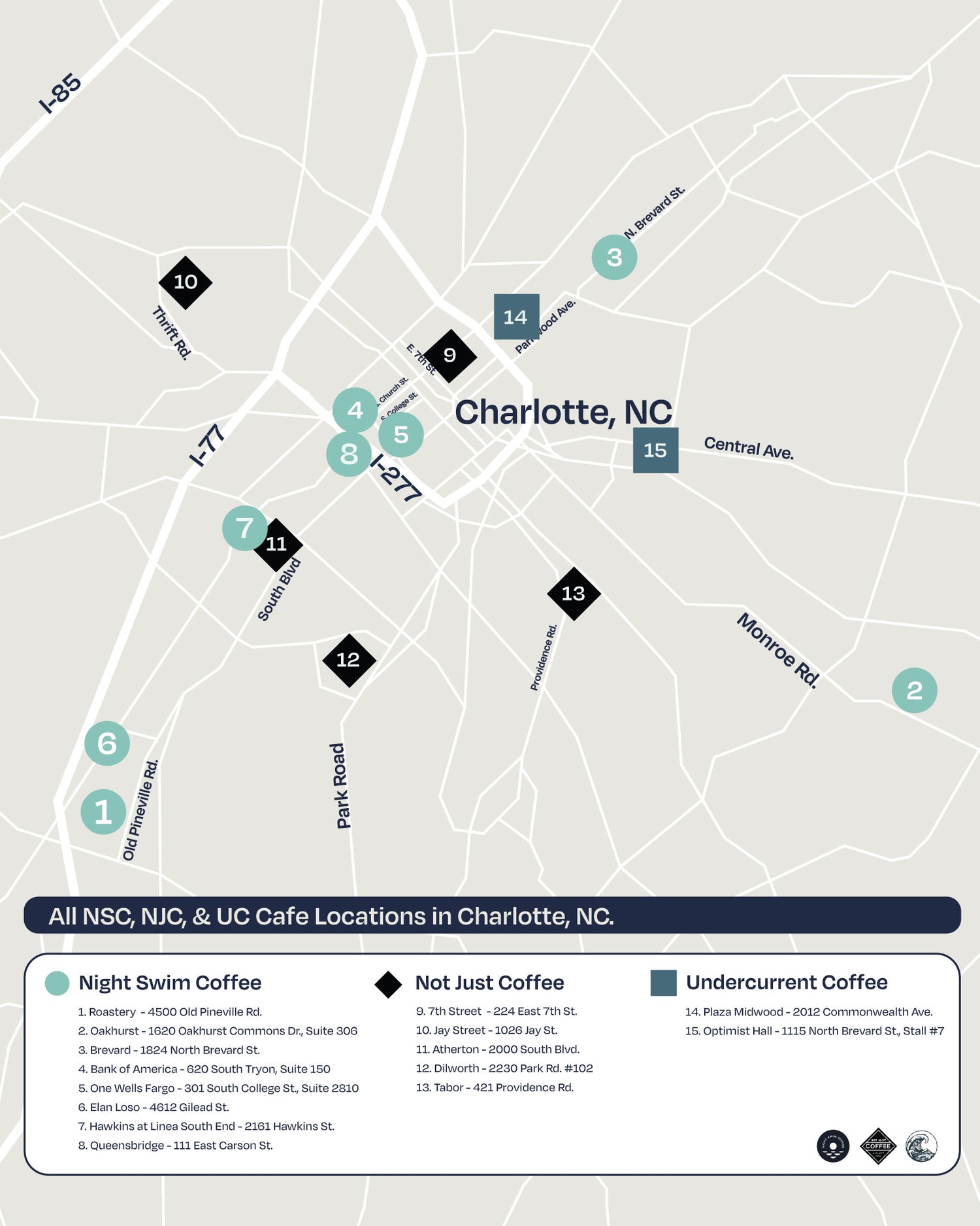 Use the map to view Night Swim Coffee, Undercurrent Coffee, and Not Just Coffee locations. You may select your preferred location(s) during the application process.